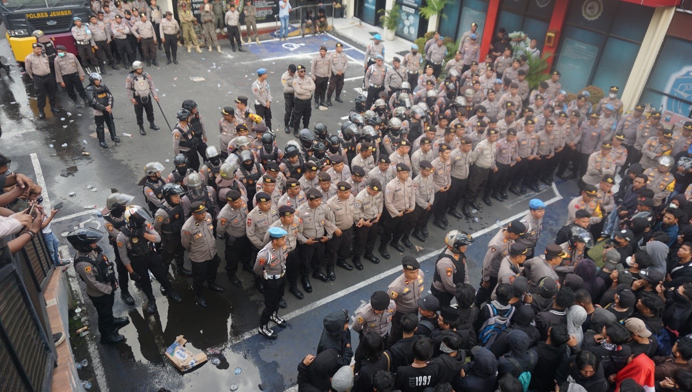 Foto yang terfokus pada barisan penjaga negara yaitu kepolisian, menjelma seperti panggung teater absurd, di mana ratusan aparat berjajar rapat dengan wajah tegang dan seragam rapi seakan sedang menjaga negara dari ancaman besar, padahal yang berdiri di depan mereka hanyalah mahasiswa dengan suara dan poster tanpa senjata api laras panjang. Sebuah ironi terbesar terlihat jelas, polisi yang seharusnya menjadi pelindung rakyat, justru tampil layaknya tembok besi yang membatasi rakyat dengan keadilan. Slogan yang mereka gaungkan “Siap Melayani Anda” di dinding belakan (foto sebelumnya), berubah jadi lelucon pahit, sebab yang lebih nyata adalah siap menggertak, siap menakuti, dan siap menutup telinga dari jeritan suara mahasiswa.
